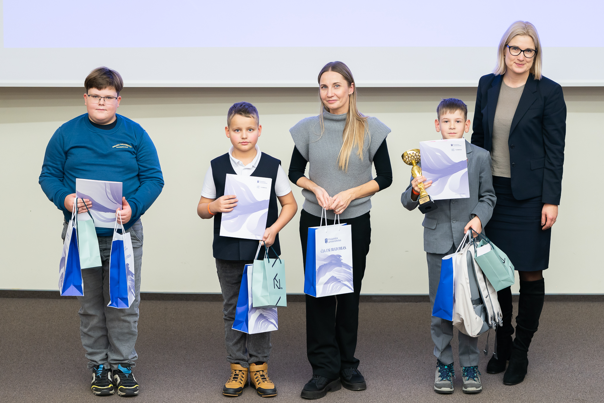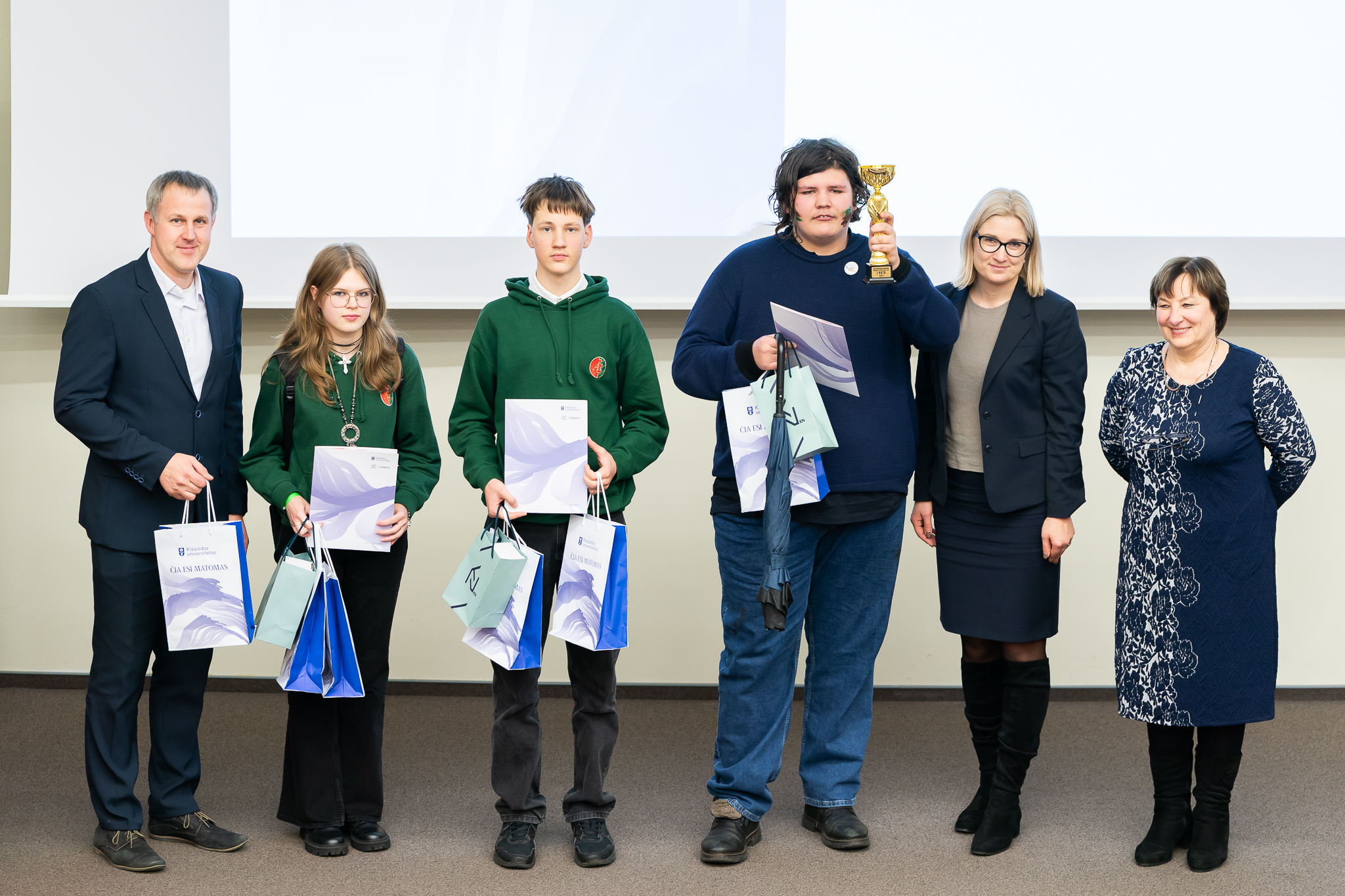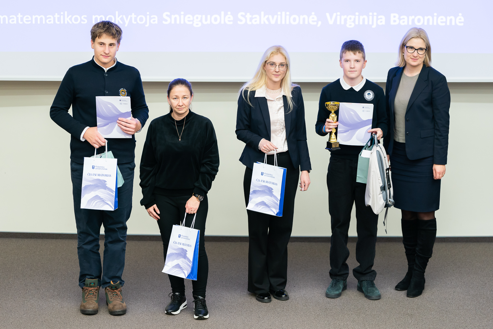 Prizines vietas užėmę mokiniai ir juos paruošę mokytojai gavo ne tik pagrindinio renginio organizatoriaus – Klaipėdos universiteto – prizus, bet ir olimpiados rėmėjų Lietuvos matematikų draugijos, Valstybės duomenų agentūros bei AB „KN Energies“ dovanas.